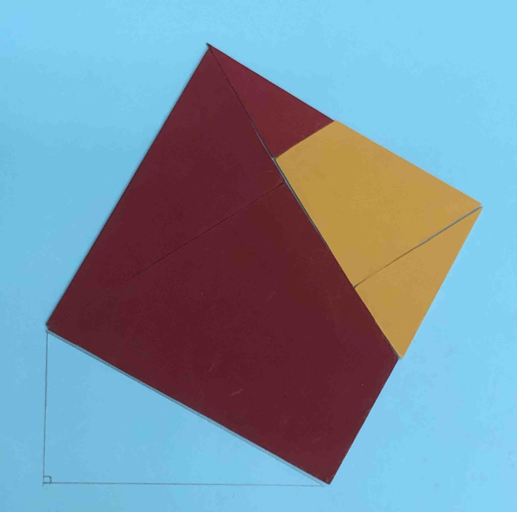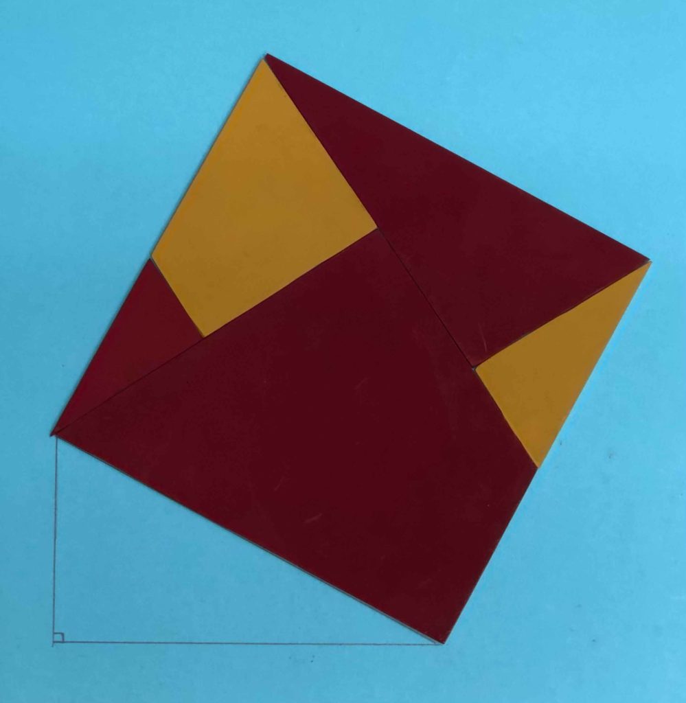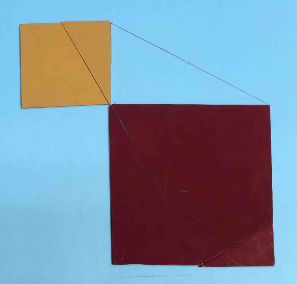 昔はピタゴラスの定理と呼ばれていました。こども新聞のコラムを参考にして、考えることを楽しむパズルとして作ってみました。正方形のアクリル板を5つのピースにカッティング(写真で確認)し、対辺と底辺にあたる2つの正方形を識別しやすくするために2色に色分けしました。5ピースの中の3つの三角形はどれも相似形です。2つの正方形から斜辺にあたる大きな正方形(配置は2パターン)を作るのは意外と難しく(逆は簡単)、頭の体操になります。身の回りには、直角三角形の恩恵はありふれていて意識もされないのですが、古くはピラミッドの建設にも、現代では相対性理論を理解する上でもとても有用です。はがきサイズ大の厚紙があれば、相似形に注意して、簡単に作ることができます。ホームステイ中のご家庭で、子どもと一緒に工作してみてはいかがでしょうか。中学生なら、作図で3平方の定理を証明できるでしょう。