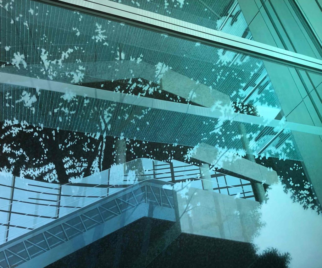 これは、ガラスに映る街路樹の柔らかい木漏れ日を描いた作品です。木漏れ日の形には自己相似性が現れていて、フラクタルな魅力があると思います。粒子と波動という相反する光の不思議な現象をフラクタルな絵画モデルによって追究したいと思っています。